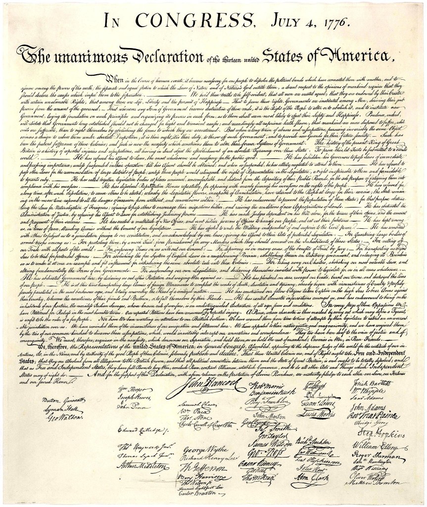 We hold these truths to be self-evident, that all men are created equal, that they are endowed by their Creator with certain unalienable Rights, that among these are Life, Liberty and the pursuit of Happiness.–That to secure these rights, Governments are instituted among Men, deriving their just powers from the consent of the governed, –That whenever any Form of Government becomes destructive of these ends, it is the Right of the People to alter or to abolish it, and to institute new Government, laying its foundation on such principles and organizing its powers in such form, as to them shall seem most likely to effect their Safety and Happiness. Prudence, indeed, will dictate that Governments long established should not be changed for light and transient causes; and accordingly all experience hath shewn, that mankind are more disposed to suffer, while evils are sufferable, than to right themselves by abolishing the forms to which they are accustomed. But when a long train of abuses and usurpations, pursuing invariably the same Object evinces a design to reduce them under absolute Despotism, it is their right, it is their duty, to throw off such Government, and to provide new Guards for their future security.–Such has been the patient sufferance of these Colonies; and such is now the necessity which constrains them to alter their former Systems of Government. The history of the present King of Great Britain is a history of repeated injuries and usurpations, all having in direct object the establishment of an absolute Tyranny over these States. To prove this, let Facts be submitted to a candid world.