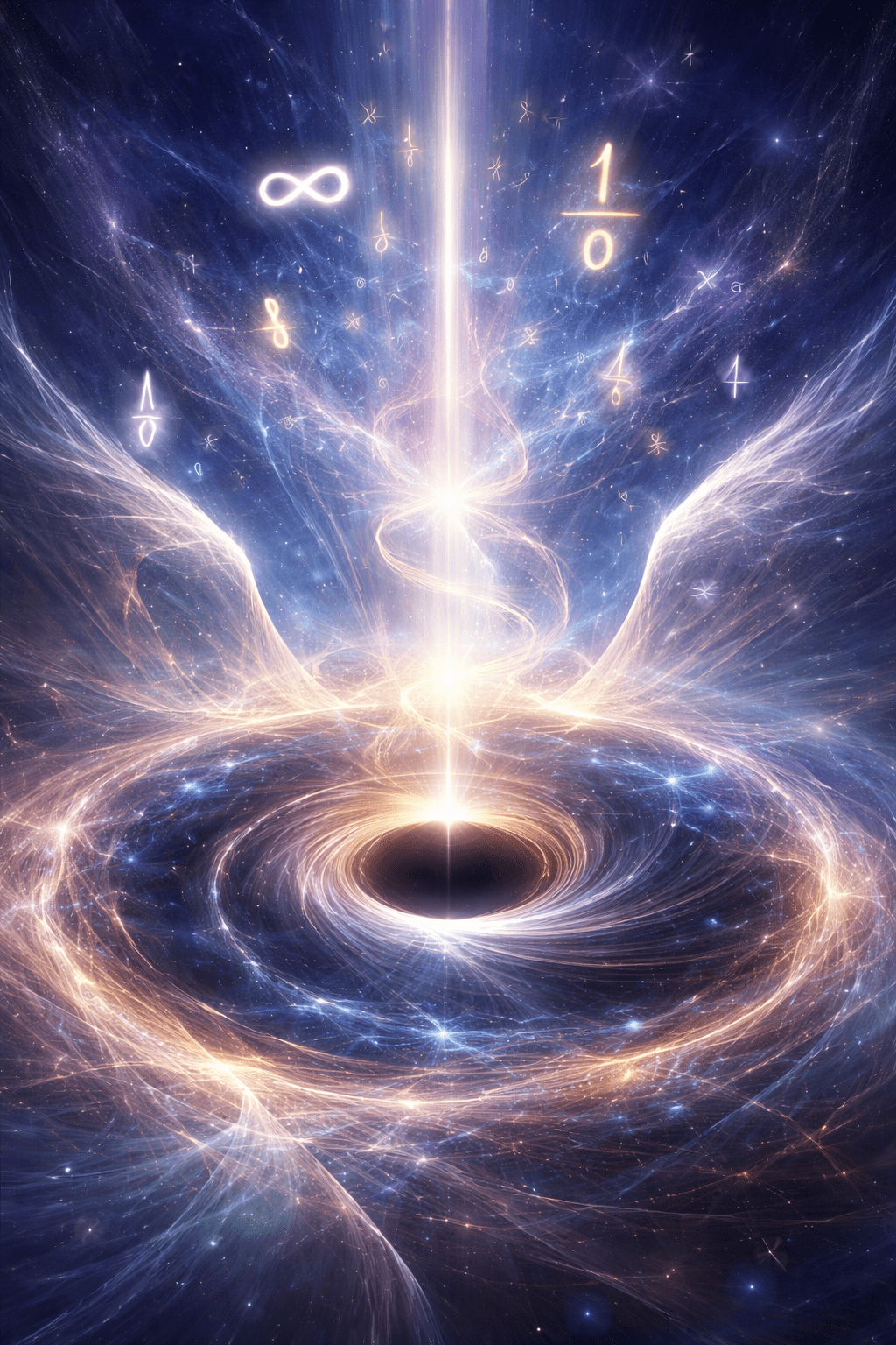 Inside the black hole, distances behave the same way. As you move inward, the concept of “distance to the center” shrinks toward zero. In the old mathematics, certain formulas divide by that distance. When the distance becomes zero, the formulas divide by zero and break. Using angel arithmetic, we say that any quantity that tries to divide by zero becomes an angel number. This transforms an undefined catastrophe into a definable transformation. It is as though the interior has slipped into a higher tier of arithmetic where new rules apply.